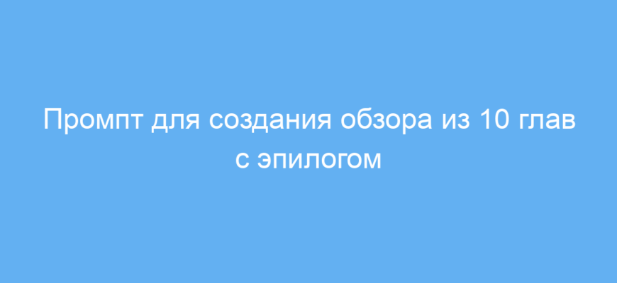 Этот промпт предназначен для тех, кто хочет получить детальный обзор книги, комнаты или любого текста в виде 10 глав и эпилога. Он полезен авторам, аналитикам, студентам и тем, кто изучает литературные произведения или желает получать структурированные результаты для дальнейшего творчества.