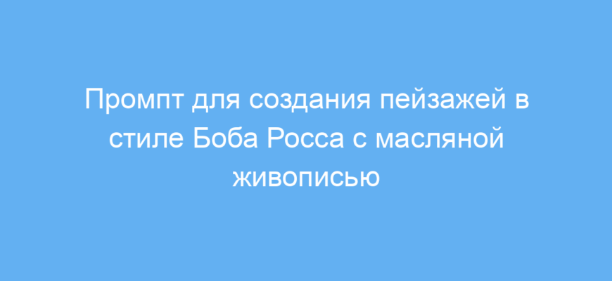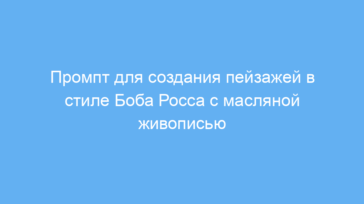 Этот промпт помогает быстро и легко создавать визуальные образы в стиле знаменитого художника Боба Росса. Он экономит время, упрощает работу с нейросетью и позволяет получить реалистичные, атмосферные пейзажи с правильной техникой и детализацией. Использование такого промпта подходит как для обучения, так и для творческих проектов, где нужна имитация классической масляной живописи.