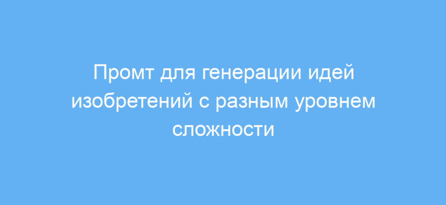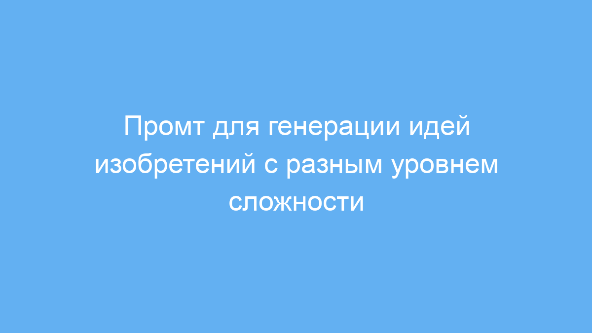 Используя этот промт, вы можете получить список из шести идей для изобретений с разным уровнем сложности: простыми, сложными и свободного уровня. Это удобно для разнообразного применения — от учебных заданий до поиска инноваций в бизнесе.