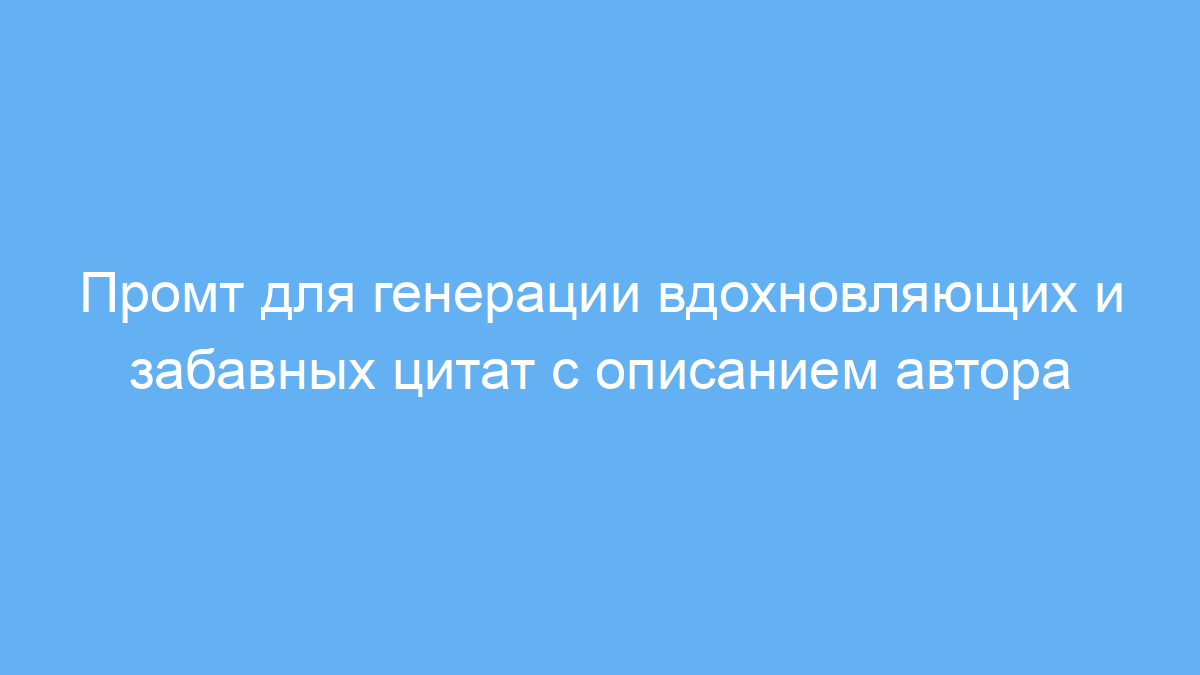 Этот промт позволяет быстро и удобно получать разнообразные цитаты, которые подходят под настроение или тему пользователя. Он экономит время на поиске вдохновляющих, мудрых или забавных высказываний, дополняя их информативными биографиями авторов. Это особенно полезно для преподавателей, блогеров, копирайтеров и всех, кто любит украшать свои тексты интересными цитатами.