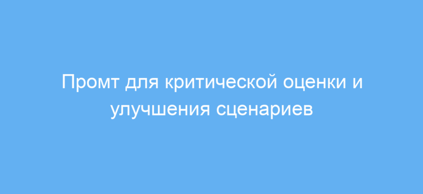 Промт работает следующим образом: пользователь предоставляет нейросети готовый сценарий, а она критически его оценивает, указывает на недостатки и предлагает конкретные идеи по улучшению. Таким образом, можно быстро повысить уровень текста и адаптировать его под нужды проекта или аудитории.