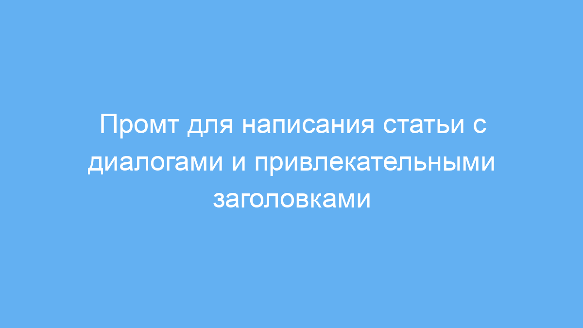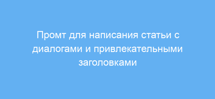 Данный промт предназначен для авторов, контент-менеджеров и маркетологов, которым нужно быстро создать структурированную статью с живыми персонажами и диалогами. Он помогает сгенерировать текст, где герои и их разговоры раскрывают тему и делают повествование более привлекательным для читателя.