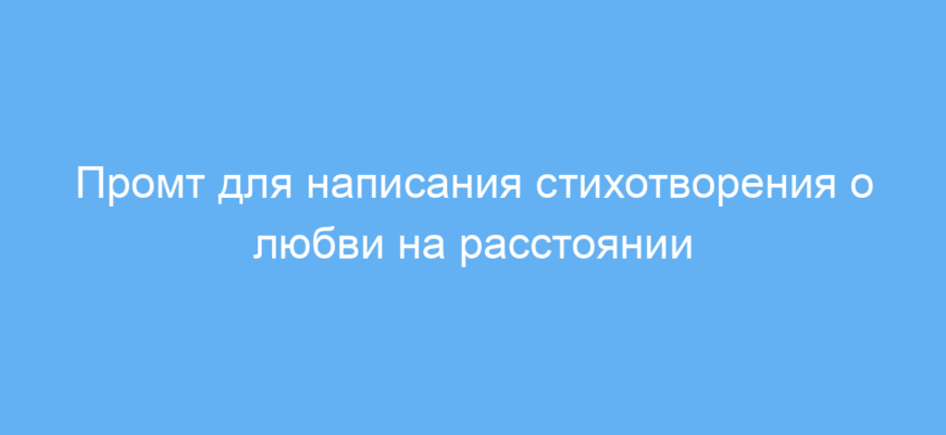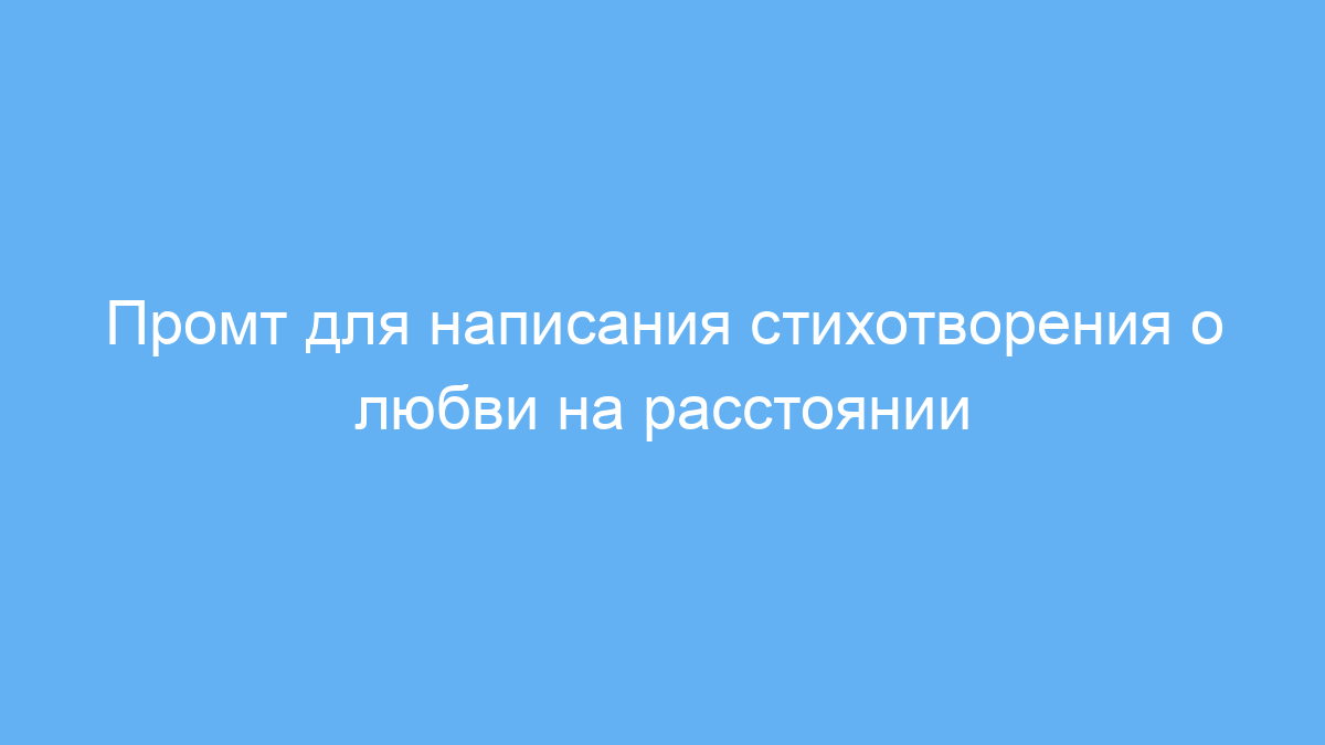 Этот промт предназначен для тех, кто хочет создать красивое стихотворение о любви на расстоянии. Его могут использовать авторы, блогеры, преподаватели, студенты и все, кто работает с текстами и хочет выразить тему разлуки, надежды и сильных чувств между двумя людьми. Такое стихотворение часто требуется для личных сообщений, творческих проектов, соцсетей или образовательных заданий.