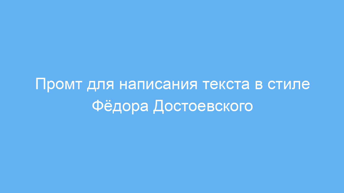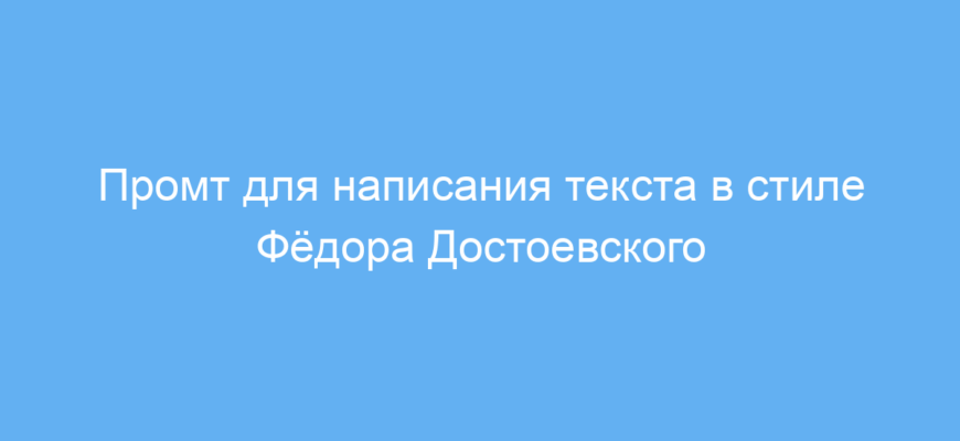 Этот промт создан для тех, кто хочет получить текст, написанный в стиле великого русского писателя Фёдора Достоевского. Он подойдёт авторам, студентам, блогерам или любителям литературы, которые хотят добавить в свои тексты атмосферу и особый стиль Достоевского.