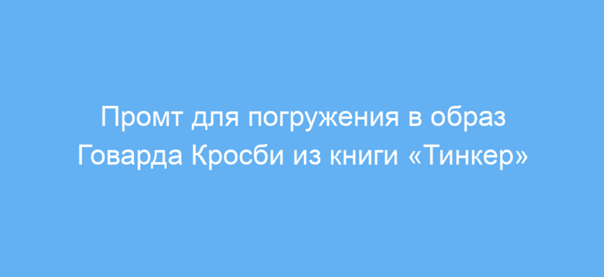 Этот промт предназначен для пользователей нейросетей, которым требуется добиться живого и аутентичного отклика от искусственного интеллекта в образе персонажа Говарда Кросби из книги «Тинкер» Пола Хардинга. Его стоит применять, когда нужна передача стиля и характера вымышленного героя — например, для творчества, ролевых игр, написания диалогов или развлечений.