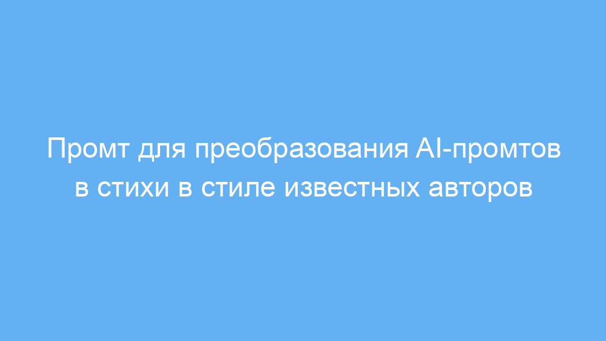Этот промт создан для пользователей нейросетей, которые хотят превратить обычные текстовые запросы (промты) в стихи, стилизованные под известных авторов. Например, вы можете получить стихотворение в стиле Шекспира, Эминема, Джонни Кэша или даже Дамблдора. Такой подход помогает сделать тексты более выразительными, творческими и уникальными.