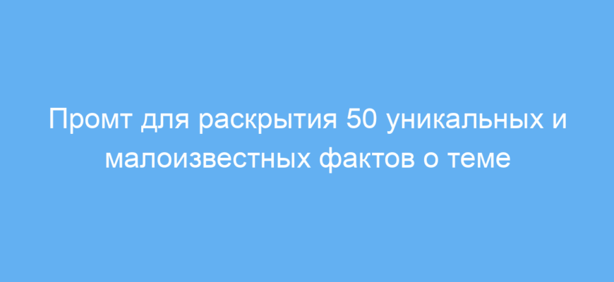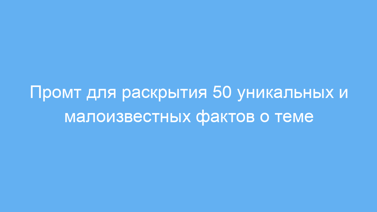 Используя этот промт, вы быстро и удобно получаете структурированный список уникальных и конкретных фактов по любой теме. Это экономит ваше время на исследование и оформление информации, упрощая подготовку качественного контента.