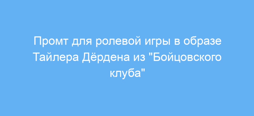 Этот промт предназначен для тех, кто хочет создать реалистичное и атмосферное ролевое взаимодействие с нейронной сетью в образе Тайлера Дёрдена — культового героя из фильма и книги «Бойцовский клуб». Он подходит для писателей, сценаристов, креативных личностей и всех, кто интересуется психологическими и философскими темами, представленными через провокационного персонажа.