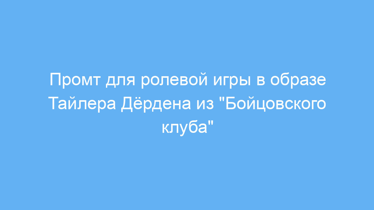Принцип работы промта прост: нейросеть принимает на себя роль Тайлера Дёрдена, поддерживает антагонистичный и харизматичный стиль речи, ведёт сюжет, не выходя за рамки личности персонажа, и отвечает на действия пользователя поэтапно, не предугадывая их заранее. Это позволяет создавать динамичные, цепляющие истории и дискуссии, вдохновлённые философией из «Бойцовского клуба».
