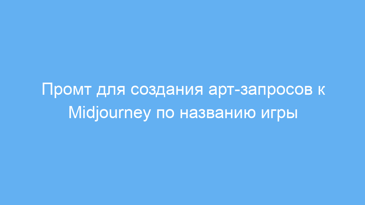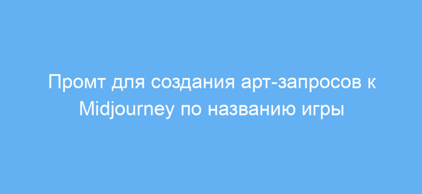 Этот промт предназначен для арт-директоров, дизайнеров, геймдев-команд и всех, кто создаёт визуальный контент на основе названий игр. Он помогает быстро получать готовые текстовые запросы (prompts) для нейросети Midjourney, чтобы генерировать образы, соответствующие тематике и стилю игры.