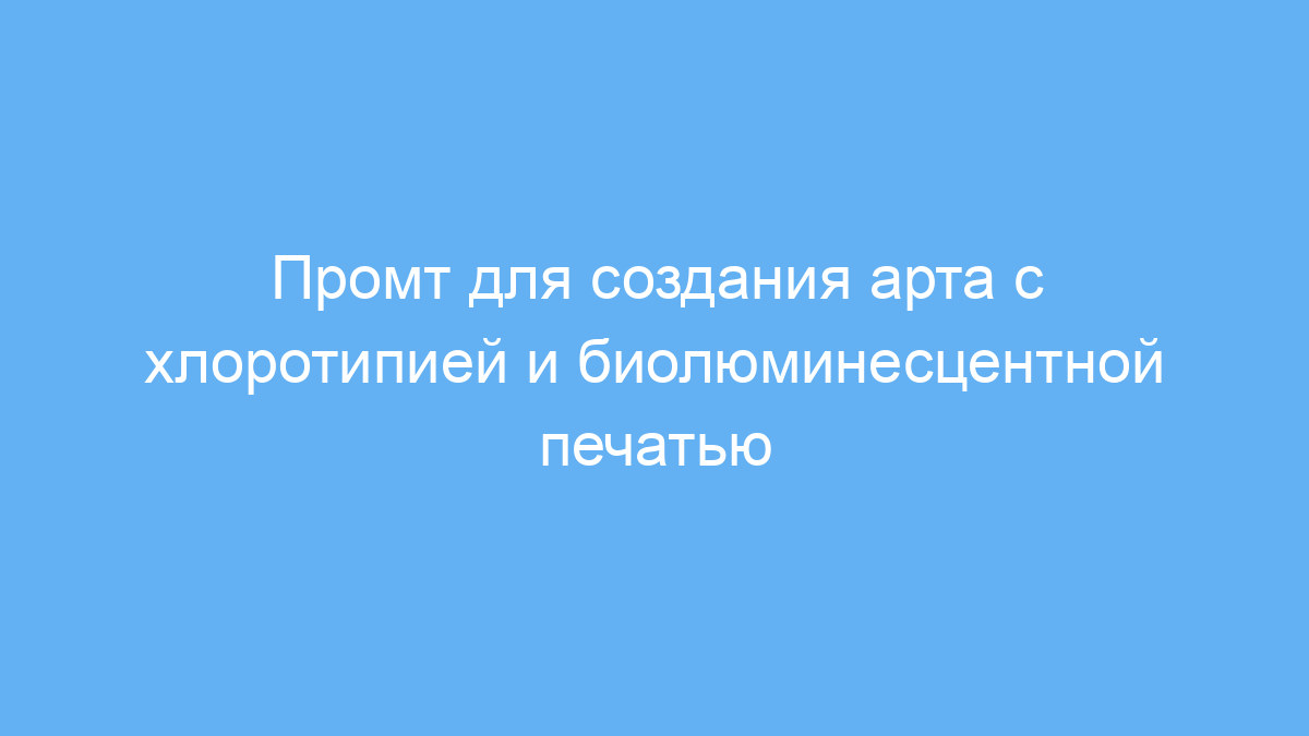 Этот промт предназначен для художников, дизайнеров и энтузиастов нетрадиционных техник в изобразительном искусстве. В нем описана идея использования метода хлоротипии — уникальной техники создания отпечатков на фоточувствительных материалах — и печати с применением биолюминесцентных червей, которые придают произведениям свечение в темноте.