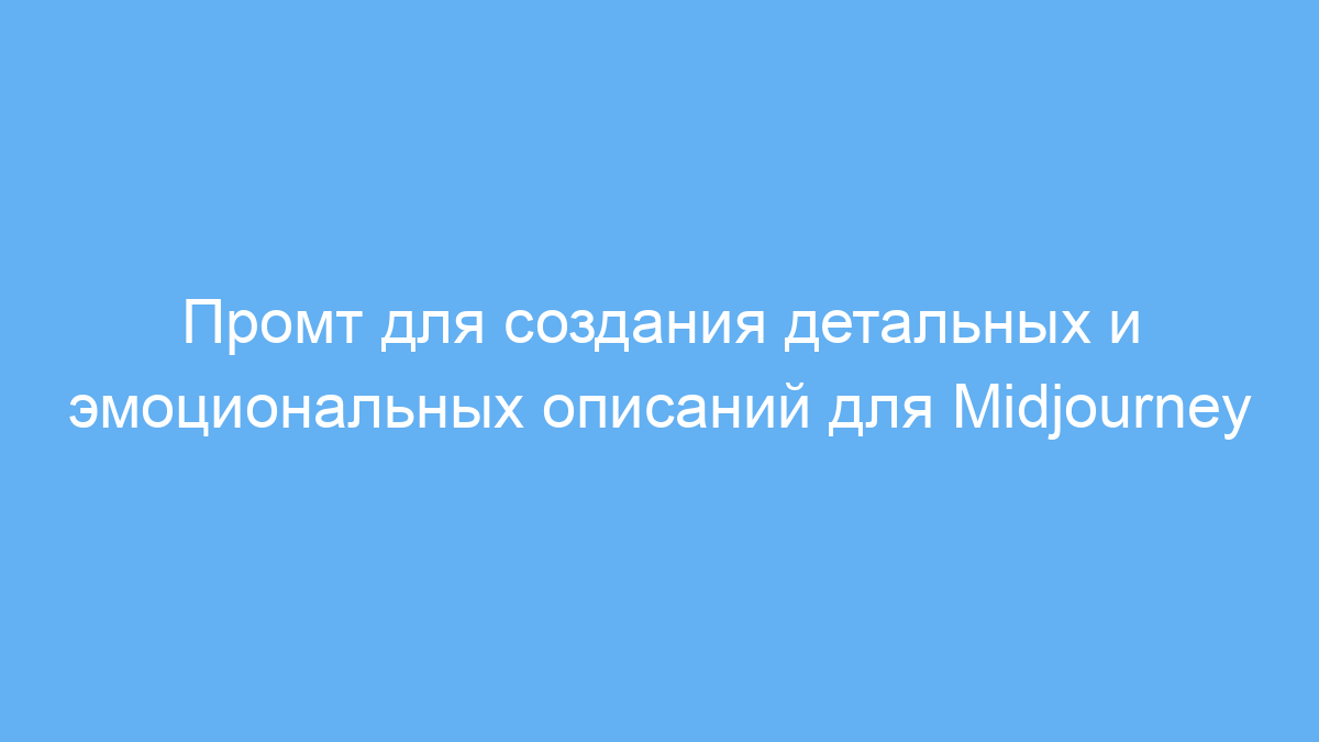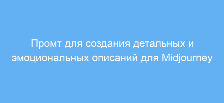 Этот промт облегчает создание богатых и эмоциональных описаний для генерации визуального контента в Midjourney. Он экономит время, увеличивает качество и вдохновляет на создание уникальных и выразительных изображений. Для пользователей, желающих получать яркие и живые картинки, работа с таким промтом — оптимальное решение.