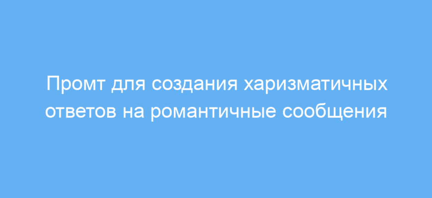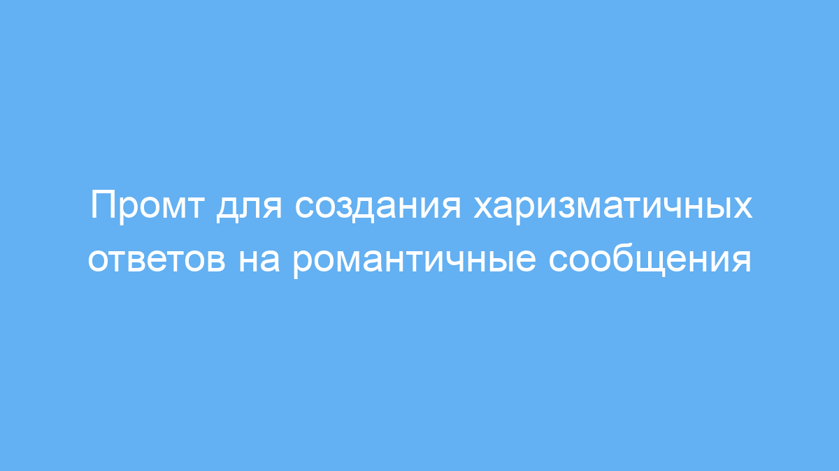 Этот промт предназначен для тех, кто хочет получать оригинальные, остроумные и привлекательные ответы на романтичные или личные сообщения. Он полезен мужчинам и женщинам, которые хотят завоевать внимание собеседника, не просто отправляя шаблонные фразы, а используя логичные и харизматичные реплики.