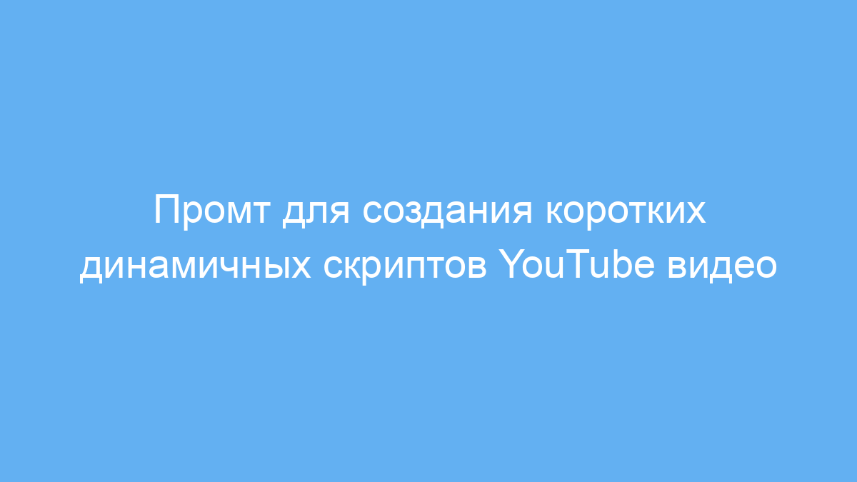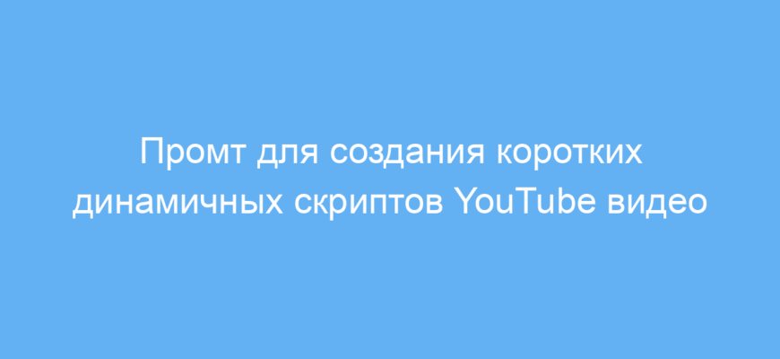 Этот промт создан для тех, кто занимается созданием коротких видео для YouTube — блогеров, маркетологов, контент-менеджеров и всех, кто хочет быстро и эффективно подготовить интересный сценарий. Он помогает решить проблему нехватки времени и идей для структурированного и увлекательного текста, который сразу цепляет зрителя.