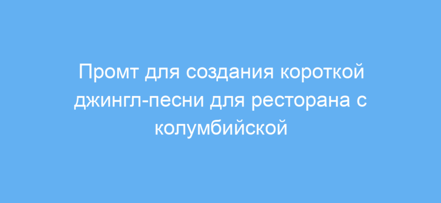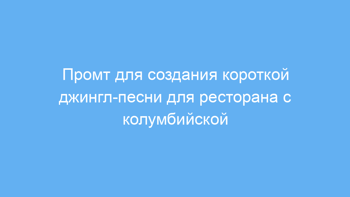 Данный промт предназначен для тех, кто хочет быстро и просто получить запоминающуюся джингл-песню для ресторана, специализирующегося на традиционной колумбийской кухне. Он помогает сгенерировать музыкальный текст, который отражает атмосферу и культуру Колумбии, вызывает аппетит и желание посетить заведение.