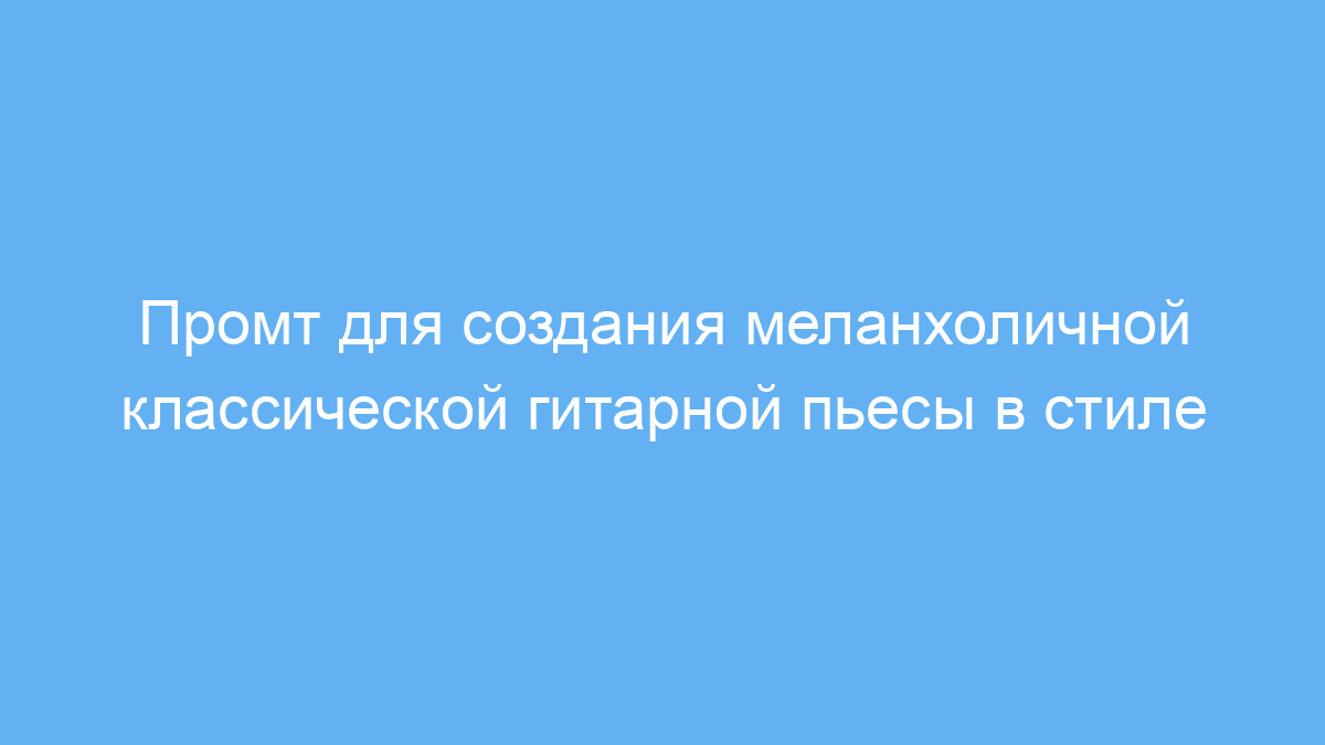 Этот промт предназначен для музыкантов, композиторов, гитаристов и создателей музыкального контента, которые хотят быстро и качественно получить классическую гитарную пьесу с определённым настроением и стилем. Он помогает решить задачу создания уникальной композиции, сочетающей меланхолию и воодушевление, используя элементы известных исполнителей и определённые техники игры на гитаре.