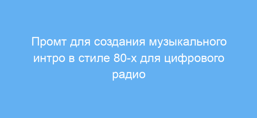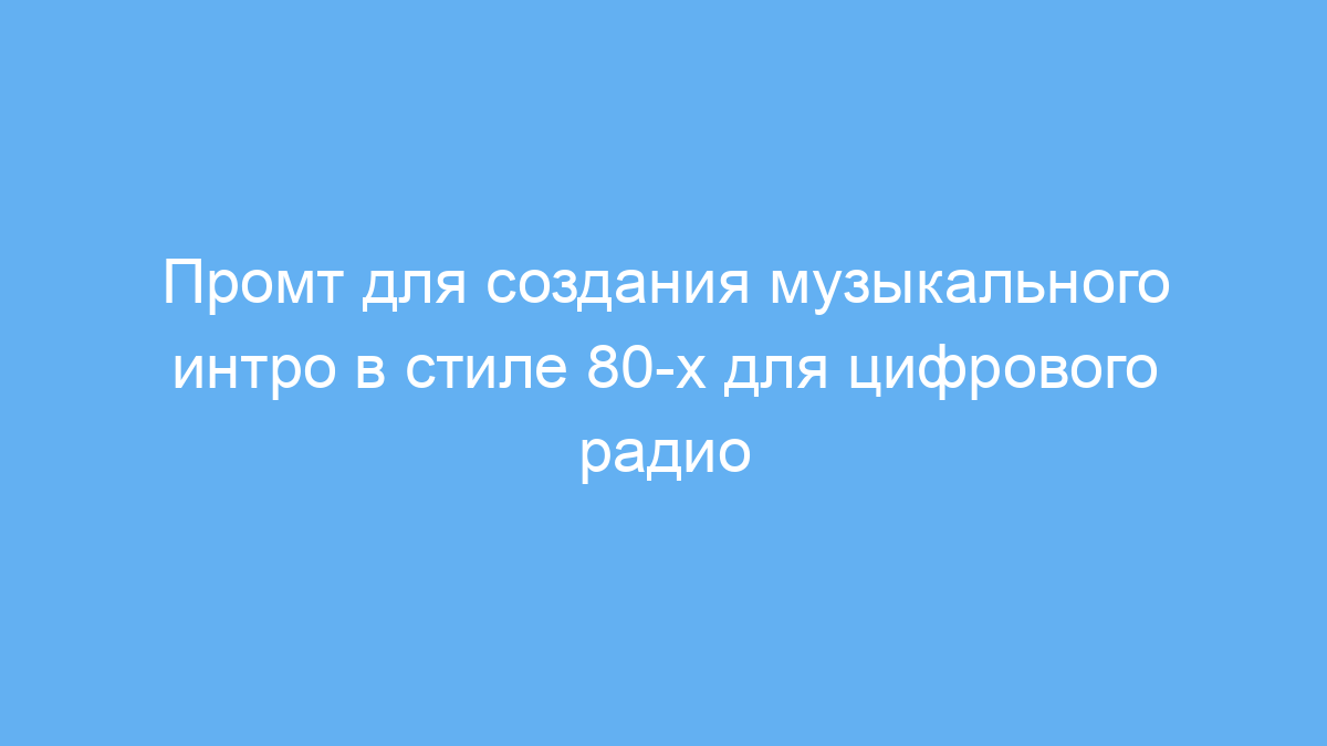 Этот промт предназначен для создателей аудио контента, диджеев и маркетологов, которые хотят быстро и эффективно создать музыкальное интро для цифрового радио. Использование готового запроса экономит время и помогает получить качественный аудиофайл, оформленный в определённом стиле.