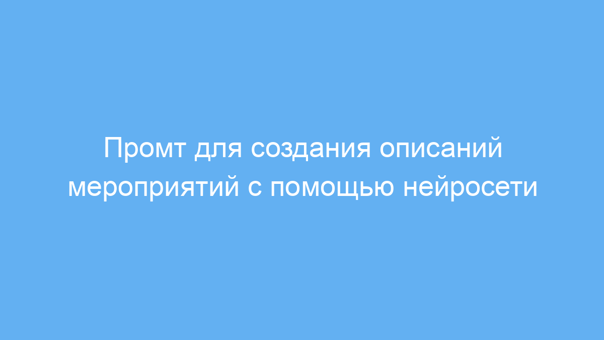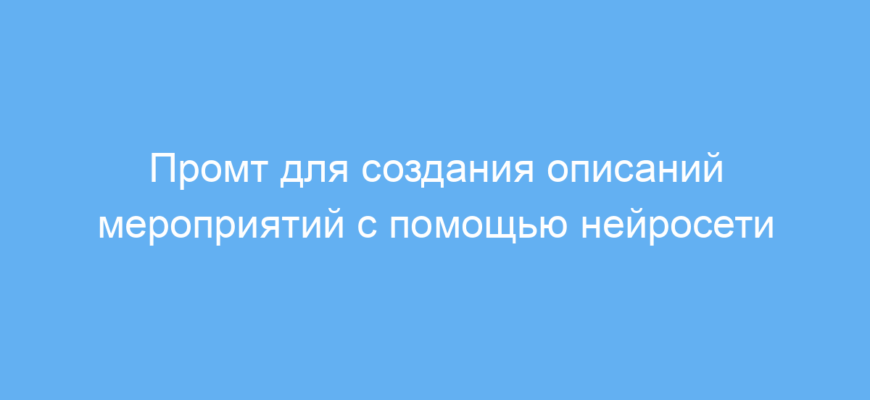 Промт решает проблему недостатка идей или слов, когда необходимо представить мероприятие интересно, емко и информативно. Он автоматически формирует удобочитаемые и убедительные тексты на основе введенных пользователем деталей — темы, даты, места и других параметров.