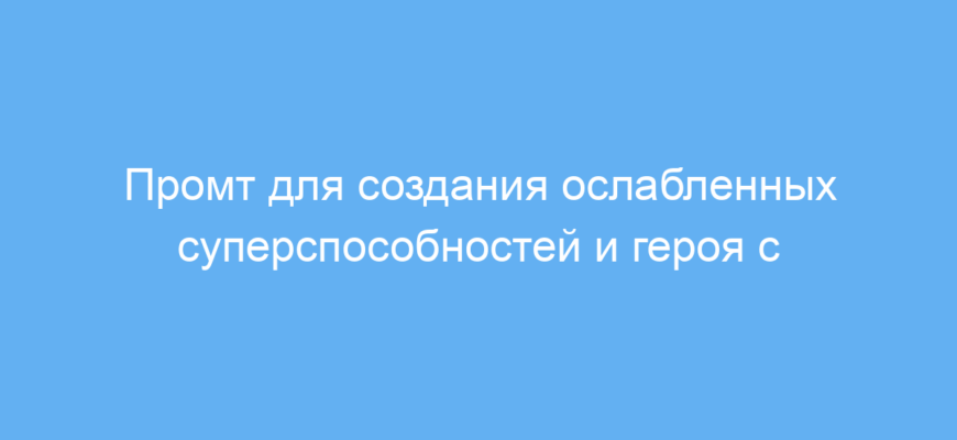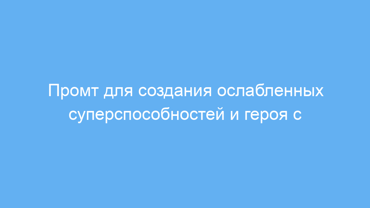 Этот промт предназначен для пользователей, которые хотят генерировать необычные и забавные варианты суперспособностей. Он помогает превратить любую сильную или крутуют способность в максимально слабую и практически бесполезную. Такой подход полезен для тех, кто создаёт персонажей для игр, комиксов, рассказов или просто развлекается с нейросетями.