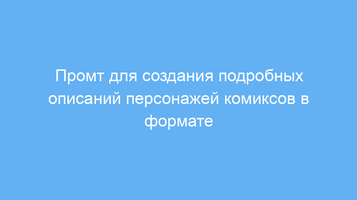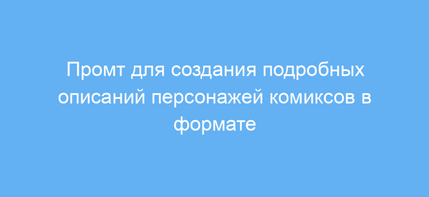 Этот промт предназначен для авторов комиксов, сценаристов и иллюстраторов, которые хотят быстро и подробно описать характеристики своих персонажей. В процессе работы над проектом важно иметь структурированное описание героя или злодея, чтобы понимать их внешний вид, характер, мотивацию и историю. Такой промт помогает автоматически генерировать эти описания в удобном формате JSON, который легко использовать в дальнейшей разработке сценариев, дизайна и презентаций.