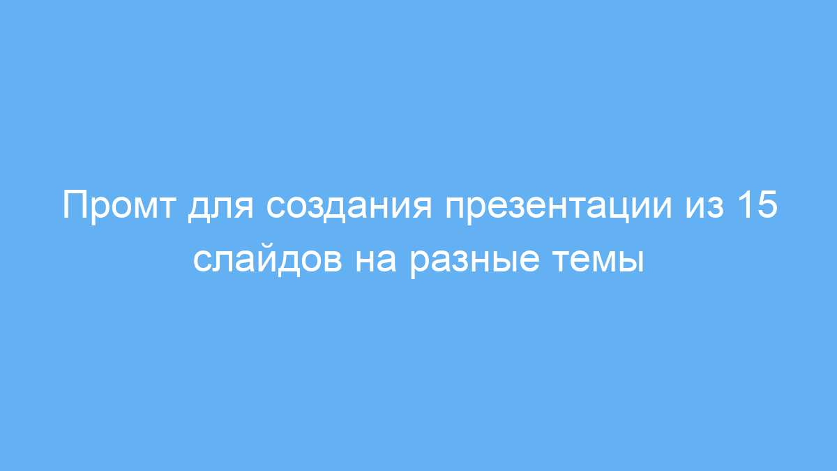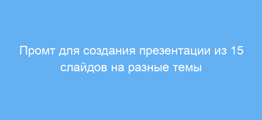 Этот промт подходит тем, кто хочет быстро и легко создать интересную презентацию, охватывающую разные темы и категории. Он поможет студентам, преподавателям, маркетологам, а также всем, кто занимается подготовкой докладов и презентаций, сэкономить время и получить структурированный материал.