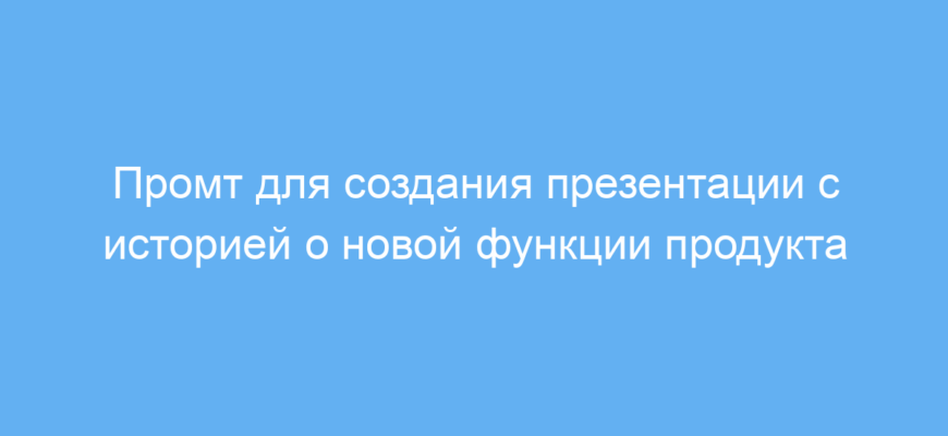 Использование этого промта позволяет быстро создавать логичные и структурированные презентации, которые легко доносят важную информацию о новых функциях продукта через интересный рассказ с персонажем. Это экономит время, повышает качество подачи и помогает лучше взаимодействовать с целевой аудиторией.