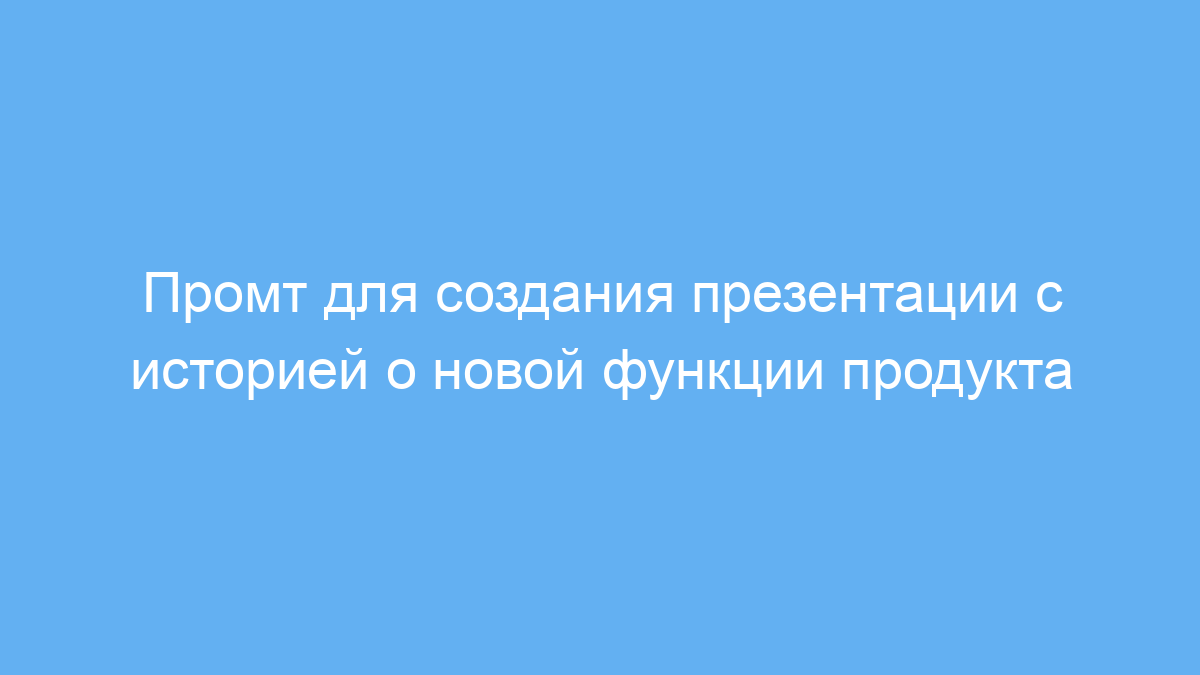 Этот промт предназначен для менеджеров продукта, маркетологов и специалистов по продажам, которым нужно быстро и эффективно создать увлекательную презентацию о новой функции продукта. Использование промта помогает структурировать информацию, сделать презентацию понятной и привлекательной благодаря сторителлингу с персонажем. Такой подход позволяет легко донести преимущества функции, сделать её более запоминающейся и мотивирующей для целевой аудитории.