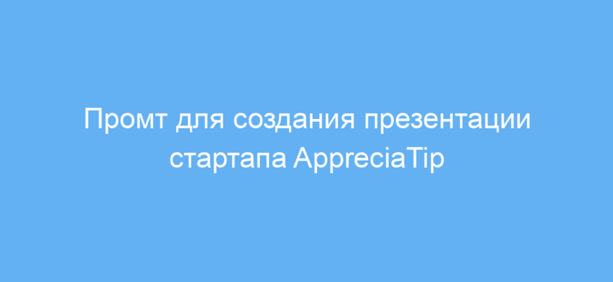 Промт позволяет быстро и качественно создавать убедительные презентации стартапа AppreciaTip. Используя его, вы экономите время на продумывание структуры текста и повышаете шансы привлечь внимание инвесторов и пользователей благодаря яркому, продуманному описанию проблемы и решения.