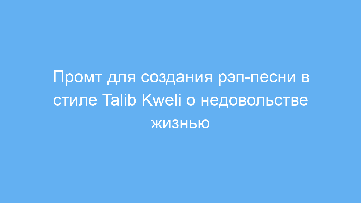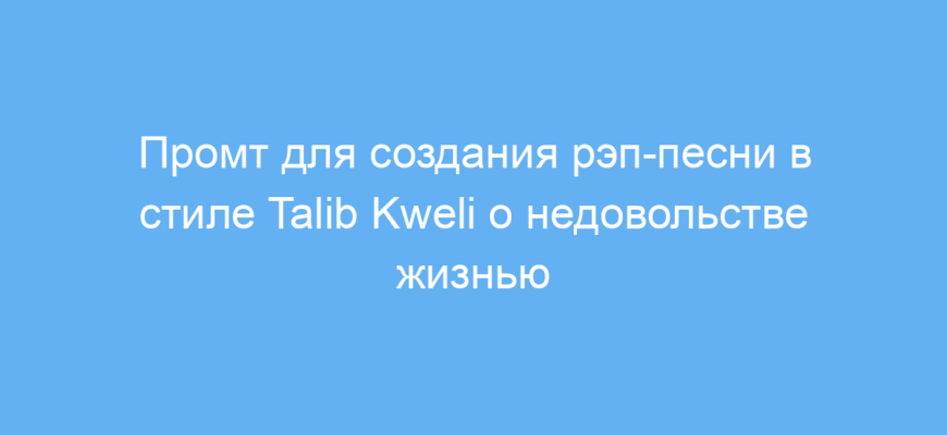 Этот промт предназначен для музыкантов, копирайтеров и контент-мейкеров, которые хотят быстро сгенерировать текст рэп-песни в духе Talib Kweli. Он помогает создать глубокий лирический трек, отражающий внутренние переживания героя, который недоволен своей текущей жизненной ситуацией. Используя такие тексты, можно вдохновить слушателей, выразить личные чувства или проработать эмоциональную лирику.