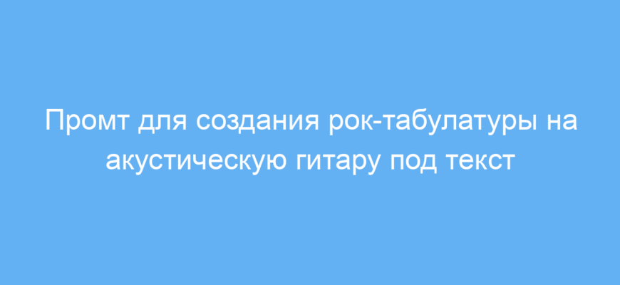 Этот промт предназначен для музыкантов, авторов песен и композиторов, которые хотят быстро получить табулатуру для акустической гитары в стиле рок под заданный текст песни. Он помогает автоматизировать создание гитарного сопровождения, что упрощает процесс аранжировки и практического исполнения.