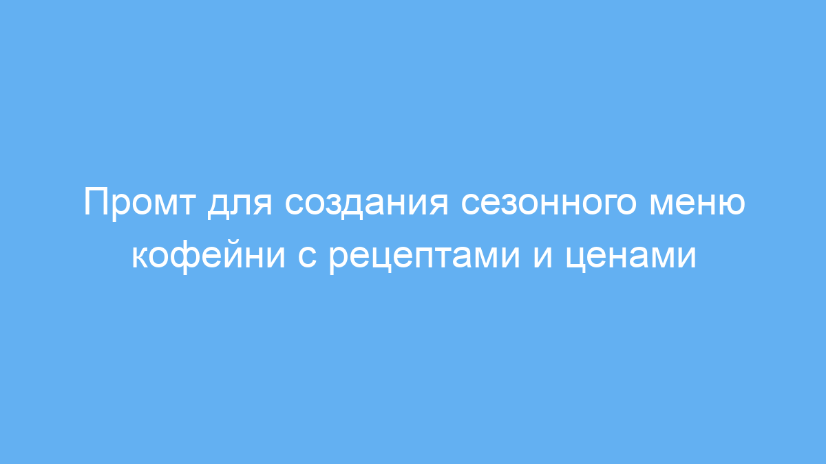 Этот промт экономит время и силы при создании сезонного меню для кофейни. Он помогает систематизировать задачи планирования, учитывать особенности региона и запросы клиентов. В итоге вы получаете готовую базу рецептов с ценами, что повышает качество обслуживания и помогает увеличить продажи.