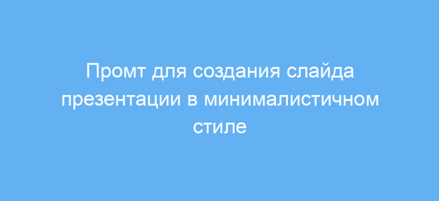 Этот промт позволяет быстро генерировать стильные, лаконичные описания слайдов для презентаций в минималистичном стиле. Он особенно полезен тем, кто хочет сэкономить время на дизайн и получить качественные идеи для оформления. Такой подход помогает создавать презентации, которые гармонично выглядят и легко воспринимаются аудиторией.