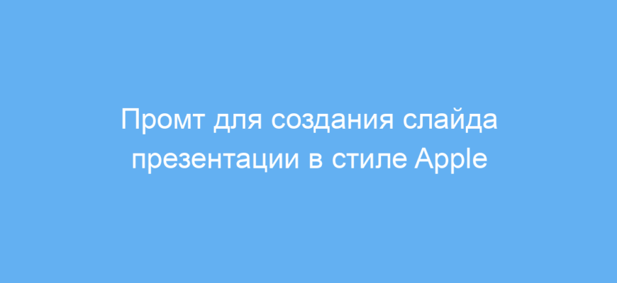 Этот промт предназначен для дизайнеров, маркетологов, преподавателей и всех, кто создает презентации. Он помогает быстро получить готовый слайд с минималистичным и современным дизайном, похожим на стиль Apple. Такой слайд привлекает внимание за счет простоты, аккуратной типографики и светлого фона.