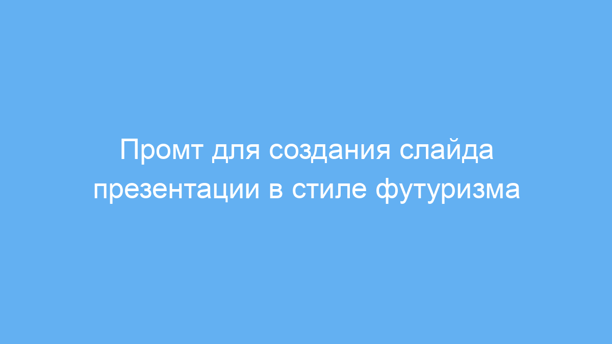 Данный промт идеально подходит для тех, кто создает презентации и хочет быстро получить слайд с привлекательным дизайн в стиле футуризма. Он помогает решить задачу генерации текста и оформления слайда с динамичными линиями и монохромной цветовой гаммой. Благодаря этому промту можно сэкономить время на дизайне и получить современный визуальный стиль без специальных навыков работы в графических редакторах.