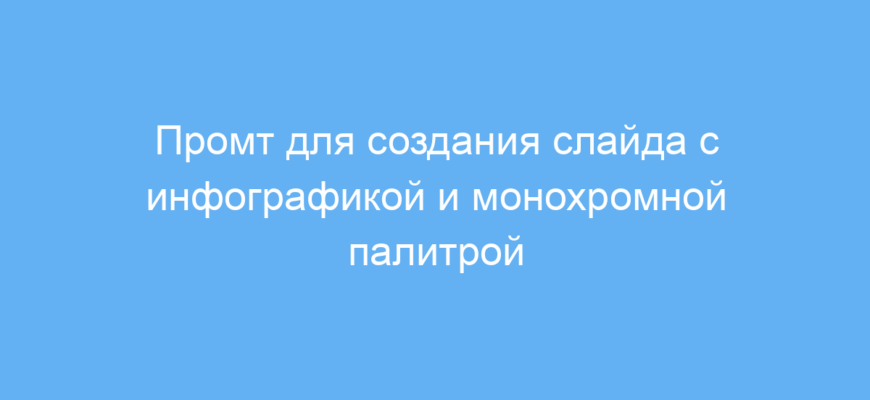Промт решает проблему времени и навыков в создании презентаций, превращая простой текстовый массив информации в привлекательную и структурированную визуализацию. Он автоматически формирует слайд с инфографикой и использует монохромную цветовую палитру с указанным акцентным цветом, что упрощает восприятие и делает презентацию стильной.