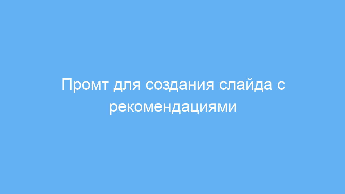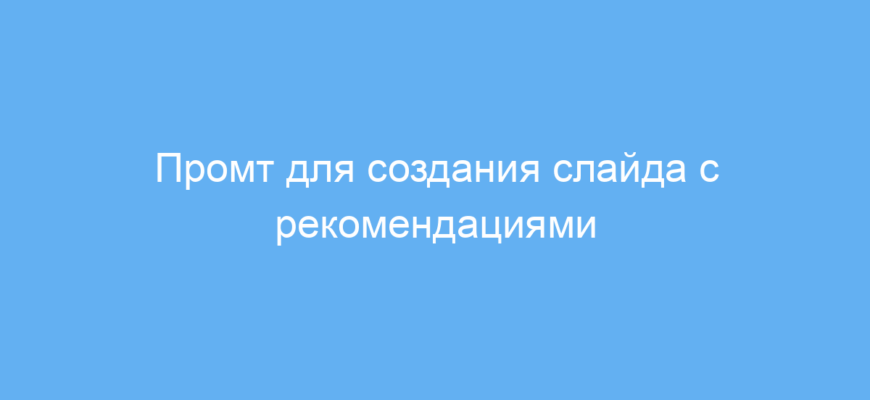 В основе работы промта лежит указание на формат слайда, создание списка советов с сортировкой по важности и использование консультативного стиля — дружелюбного, но профессионального. От пользователя требуется только заполнить тему рекомендаций; остальное сделает нейросеть.