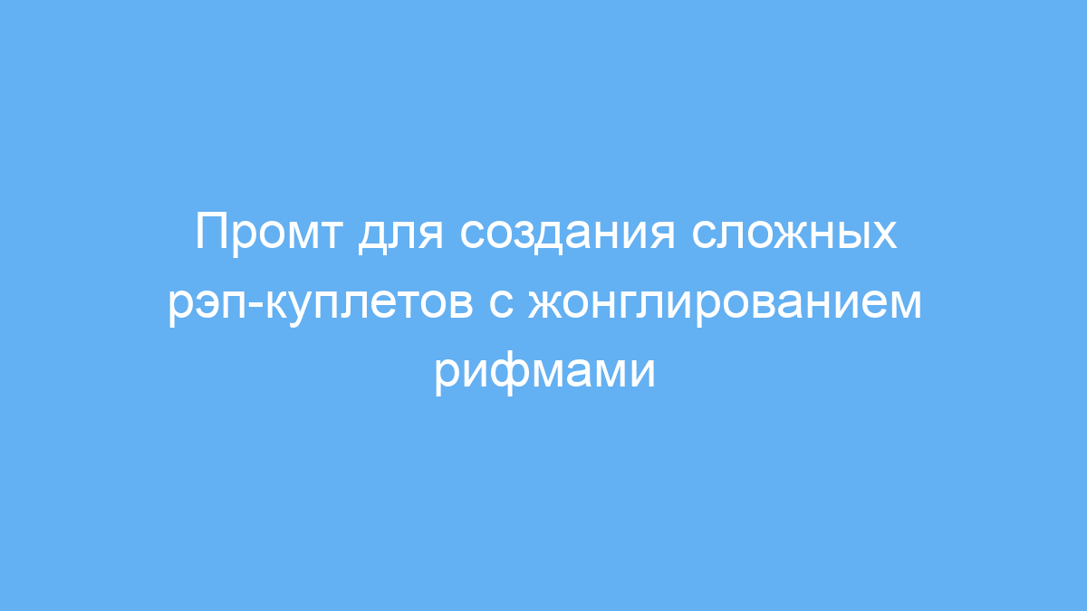 Промт решает задачи, связанные с поиском оригинальных рифм, поддержкой тематической целостности и увеличением плотности рифм. Он подходит для тех, кто изучает рэп, экспериментирует с лирикой или готовит материалы для выступлений и записей.