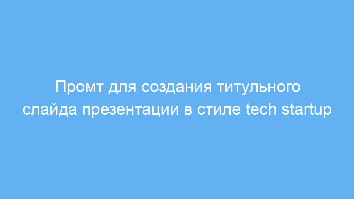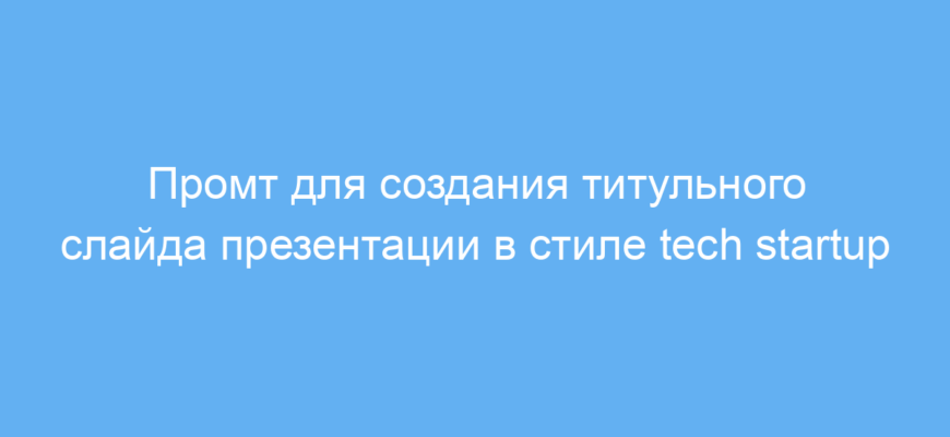 Промт помогает сформировать слайд с заголовком, именем спикера и датой, оформленный в модном и привлекательном стиле tech startup. Это экономит время и избавляет от необходимости самому думать над структурой и дизайном, позволяя нейронной сети сразу сфокусироваться на нужных элементах.