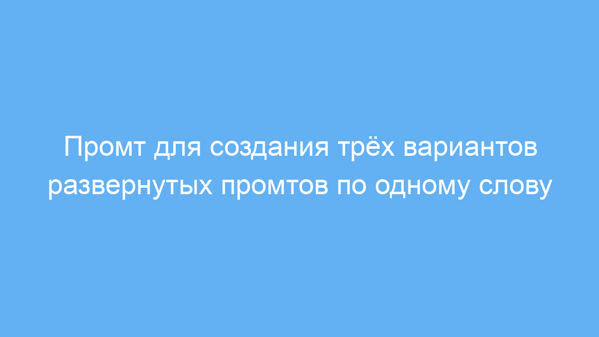 Этот промт предназначен для художников, дизайнеров и пользователей нейросетей, которым нужно быстро получать подробные, творческие промты для генерации изображений. Он помогает превратить простое слово или идею в три уникальных и детализированных запроса, которые расширяют визуальное представление и улучшают качество создаваемого изображения.