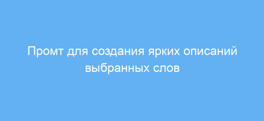 Данный промт предназначен для пользователей нейросетей, которым нужно быстро и эффектно получить визуальное описание любого слова. Он поможет писателям, блогерам, копирайтерам и студентам создавать живые, образные тексты, которые будут легко восприниматься читателем и делать контент выразительным.