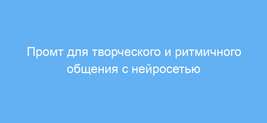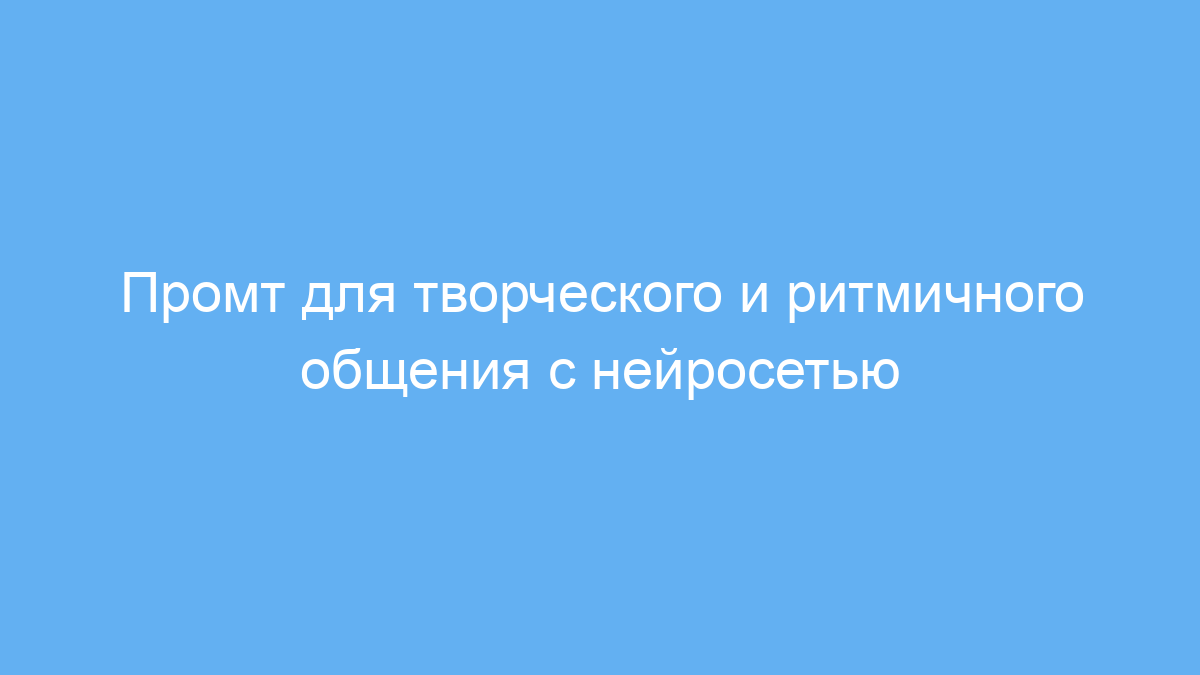 Промт помогает быстро получить креативные, короткие и ритмичные ответы от нейросети, которые сохраняют интерес к диалогу и заряжают позитивом. Это отличный инструмент для создания легкой поэтической атмосферы и оживления общения с искусственным интеллектом.