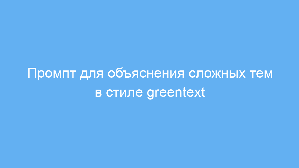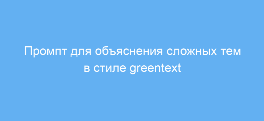 Этот промпт предназначен для тех, кто хочет быстро и просто объяснять сложные темы, используя популярный формат greentext — короткие, лаконичные и понятные фразы с маркированными списками. Его часто применяют студенты, преподаватели, блогеры и создатели образовательного контента, чтобы донести идеи по науке, философии, истории и другим серьёзным темам без перегрузки информацией.