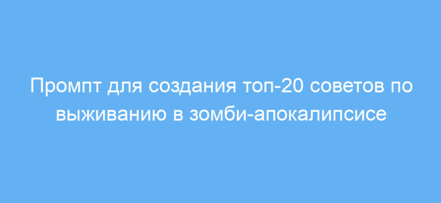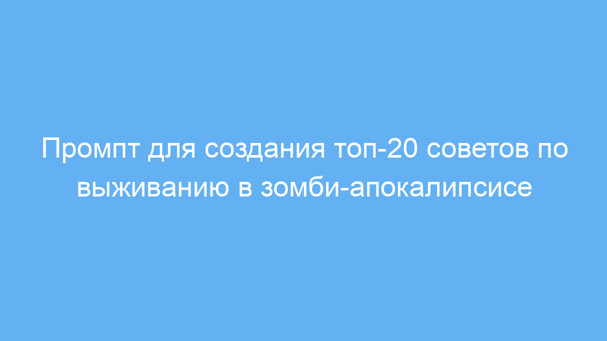 Этот промпт предназначен для тех, кто хочет быстро получить структурированные и подробные рекомендации по выживанию в экстремальной ситуации, такой как зомби-апокалипсис. Он помогает сгенерировать полезный и систематизированный список советов, который особенно ценен для новичков и людей, интересующихся темой выживания.