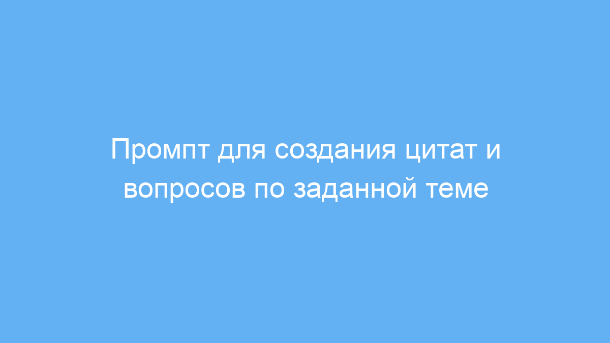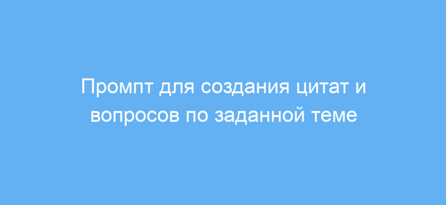 Промпт автоматически находит цитаты по заданной теме и формулирует вопросы, вставляя цитаты в двойные угловые кавычки <<>>. В конце добавляет вопросы для обсуждения, что упрощает подготовку к урокам, семинарам или публикациям в блогах. Пользователю достаточно указать тему — и нейросеть создаст готовый к использованию список цитат и вопросов.