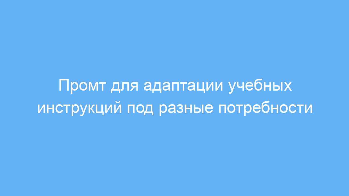 Проблема, которую решает данный промт — это высокая разнородность учеников по уровню подготовки, стилю восприятия информации и способам взаимодействия с учебным материалом. Промт предлагает несколько вариантов адаптации инструкций, включая работу с учителем и сверстниками, творческие задания и интерактивные методы.