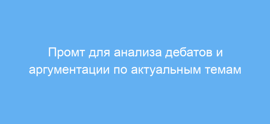 Как работает промт? Вы задаёте тему, связанную с актуальными событиями. Искусственный интеллект выступает в роли дебатёра: рассматривает позицию каждой стороны, предлагает сильные аргументы, опровергает противоположные мнения и формулирует убедительные выводы на основе фактов. Это помогает разобраться в сложных вопросах и увидеть их с разных точек зрения.