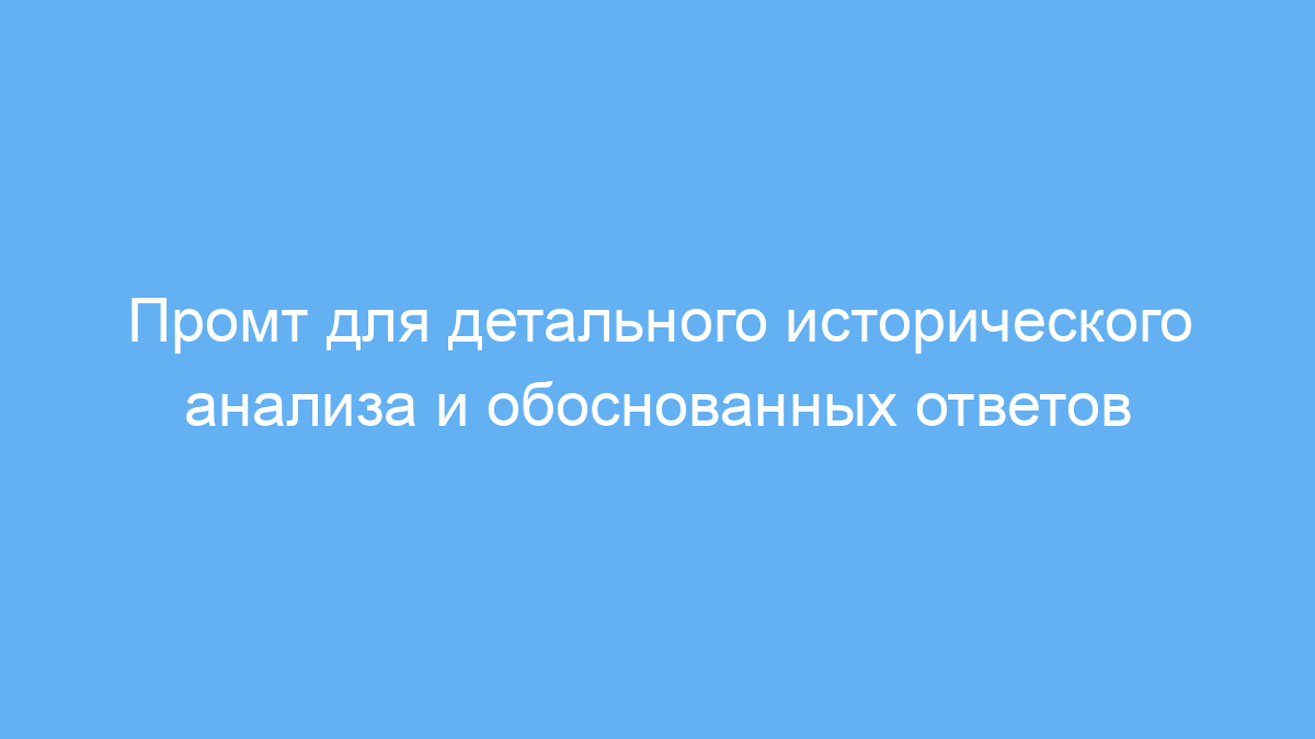 Этот промт создан для тех, кто хочет получить глубокое, обоснованное и многогранное объяснение по академическим или интеллектуальным вопросам в области истории и смежных наук. Он подойдёт студентам, преподавателям, исследователям и всем, кто интересуется историей и хочет получить квалифицированную информацию, понятную и структурированную одновременно.