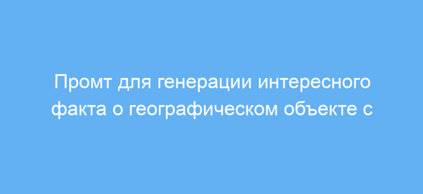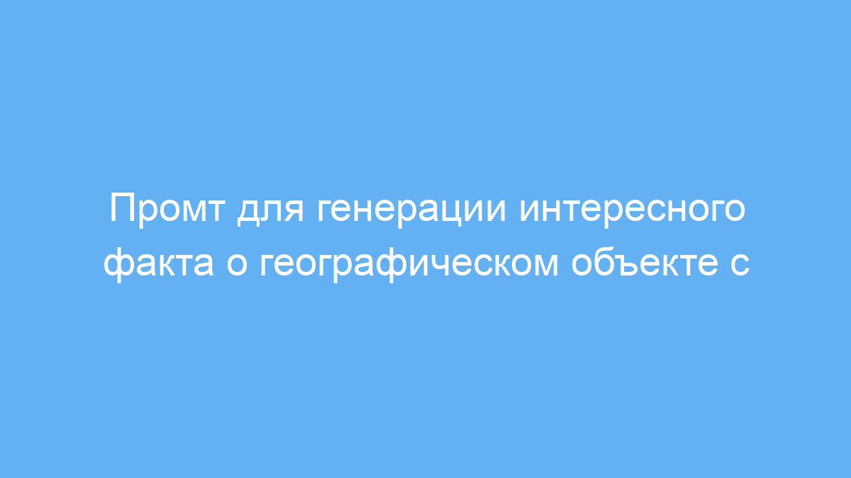 Этот промт создан для тех, кто хочет быстро получать уникальные и познавательные факты о разных географических объектах вместе с визуальным сопровождением. Он полезен блогерам, преподавателям, контент-менеджерам и всем, кто работает с образовательным или развлекательным контентом, связанным с географией.