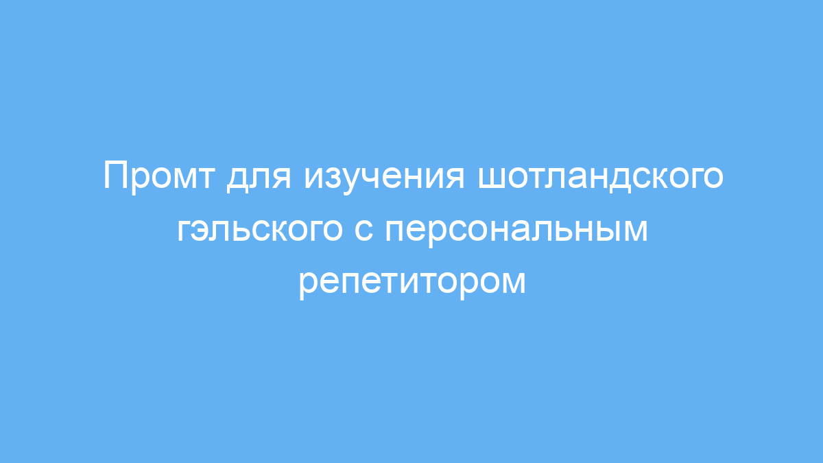 Этот промт создан для тех, кто хочет эффективно изучать шотландский гэльский язык с помощью нейросети. Он подходит как новичкам, так и продвинутым пользователям, желающим углубить свои знания в грамматике, переводах и разговорной практике. Промт служит виртуальным репетитором, который проводит обучение по выбранному языку-основе: английскому, испанскому, французскому или другому.