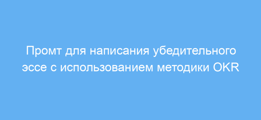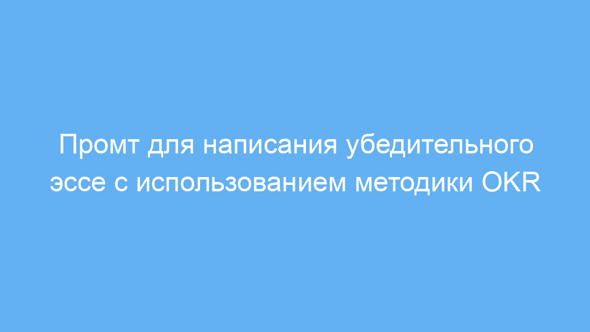 Этот промт решает проблему недостатка навыков убеждающего письма, сложностей в организации текста и отсутствии чёткого плана работы. Используя фреймворк OKR (Цели и ключевые результаты), он обеспечивает фокус на цели и помогает выстроить логическую и последовательную структуру эссе — от введения до заключения.